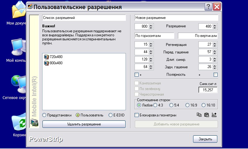 Суть проблемы: интеловская графика (i910, i915, i945...), оккупировавшая привлекательный рынок UMPC, не имеет адаптивного инструментария настройки пользовательских разрешений для non-DDC мониторов и, особенно, мониторов с черезстрочной разверткой. Решаемая задача: подключение монитора штатной навигации (interlaced, pixelclock <20MHz) к Asus eeePC 701 4G. Всеми любимый PowerStrip от EnTech не справляется с поставленной задачей. За период работы (пляски с бубнами) над темой: - внимательно изучены имеющиеся интернет ресурсы. Особо следует отметить наличие полезной, но неисчерпывающей иформации на AVS Forum и Intel® Software Network Knowledge Base Wiki. Да еще заслуживает внимания этот блог, хотя автор и отказался решить задачку за несколько баксов; - проработана техническая документация на чипсет Intel® Graphics Media Accelerator 900 Series Software Developer's Guide; - проведена генерация пользовательских драйверов в соответствии с Intel® Embedded Graphics Drivers and Video BIOS v8.0. Много буковок и никакого результата! В документации нет прямых ограничений на работу чипсета в нужном нам режиме. Не могут они композитную синхронизацию выдавать на CRT порт - это прописано, а про interlaced молчок. Должен работать и не работает! Постепенно осознание проблемы сузилось на некорректной работе связки VBIOS\драйвер. Девелоперы от интела вводят ограничения на пользовательские разрешения исходя из легенды, что ими можно вывести из строя монитор. Но все же - где собака зарыта? Не в драйвере - генерация пользовательского не дает результата. Значит VBIOS, почему-то не нравятся ему тайминги с pixelclock <20MHz. Задача генерации пользовательского VBIOS решаема, но отнимет уйму времени, которого нет. Уже хотел прекратить пляски, но тут натолкнулся на форум любителей подключеня PC к мониторам игральных автоматов. И проблема схожая и утилитка соответствующая есть Soft15khz. Поставил ее не глядя - появилась куча дополнительных возможных разрешений, но нужного нет. Подправил реестр и монитор заработал! При этом LVDS в режиме 800х480р, а CRT -720х480i. Повторяемости получить не удалось, но вынес главное - задача решаема. И решение оказалось очень простым. Ниже приведена методика, которая может быть использована для всего ряда интеловских чипсетов (с родными драйверами) при подключении non-DDC мониторов. Для экспериментов нам необходимо иметь: - значения таймингов для планируемых разрешений non-DDC монитора; - DTD калькулятор от Clevertechnologies; - PowerStrp, не очень старый. У меня 3.78 b616; - не обязательно, но может пригодиться заглушка на D-Sub15. Приступаем к танцу, тьфу - к операции. Пациент, ничего выдающегося - стандартная комплектация, лицензионная ось. Испытания проводились и на обрезанной. Результат аналогичен и на тему не влияет. Чипсет 910, штатные дравера Делаем необходимую пластику реестру. Штатным Regedit. Ищем ключи, содержащие TotalDTDCount Изменяем найденное значение 0 на 5. Заменить эти значения надо во всех строчках реестра (их 18). Так что F3 жать не забываем. Указанная операция позволит нам создать пять пользовательских разрешений для CRT порта. Больше интел не позволяет. Продолжаем операцию. Или руками, или пользуя DTD калькулятор. Прописываем исходные тайминги разрешений, начиная с низшего. Для мониторов штатных навигаций важны параметры interlaced и sync (-hsync -vsync). Для других типов мониторов надо знать параметры синхронизации. Для 720х480i это выглядит так: Для 800х480i Прописываем скалькулированные строчки в реестр. Делать это надо послед