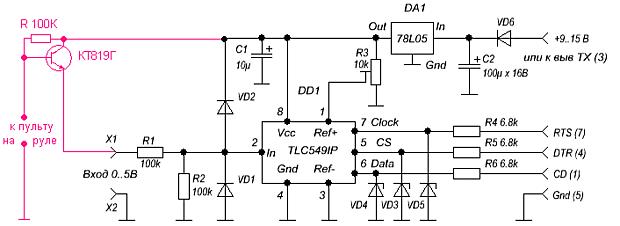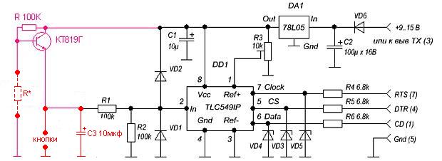 5) если вы подключаете АЦП напрямую к com порту, то питание лучше взять с выводу ТХ (3), это вас избавит от лишних проводов и поиска источника питания.